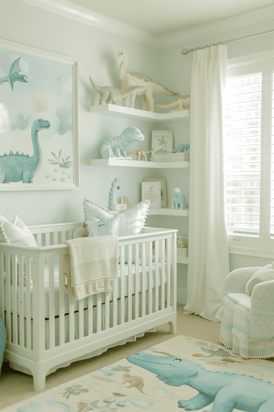 Display pastel dinosaur toys on floating shelves and add a plush dinosaur rug for a cozy play area. Watercolor dinosaur art brings a touch of whimsy and serenity to the room.