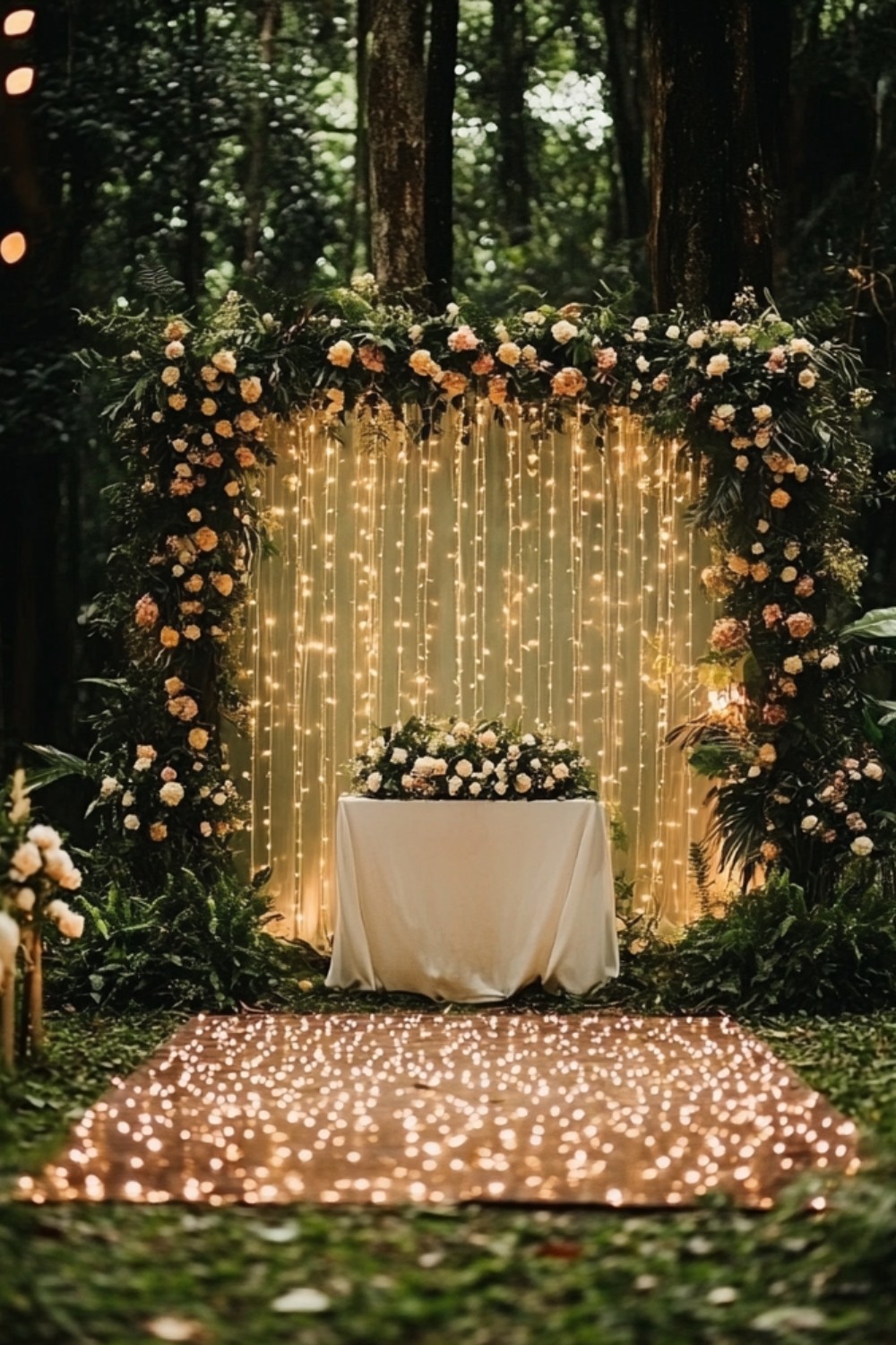 Create an enchanting atmosphere with a curtain of fairy lights strung between two trees or wooden poles. This sparkling backdrop is particularly stunning as dusk falls, illuminating the forest with a soft, romantic glow. Pair the lights with sheer fabric or delicate greenery for added depth. This design offers a magical, celestial feel, ideal for an evening forest wedding filled with love and light.