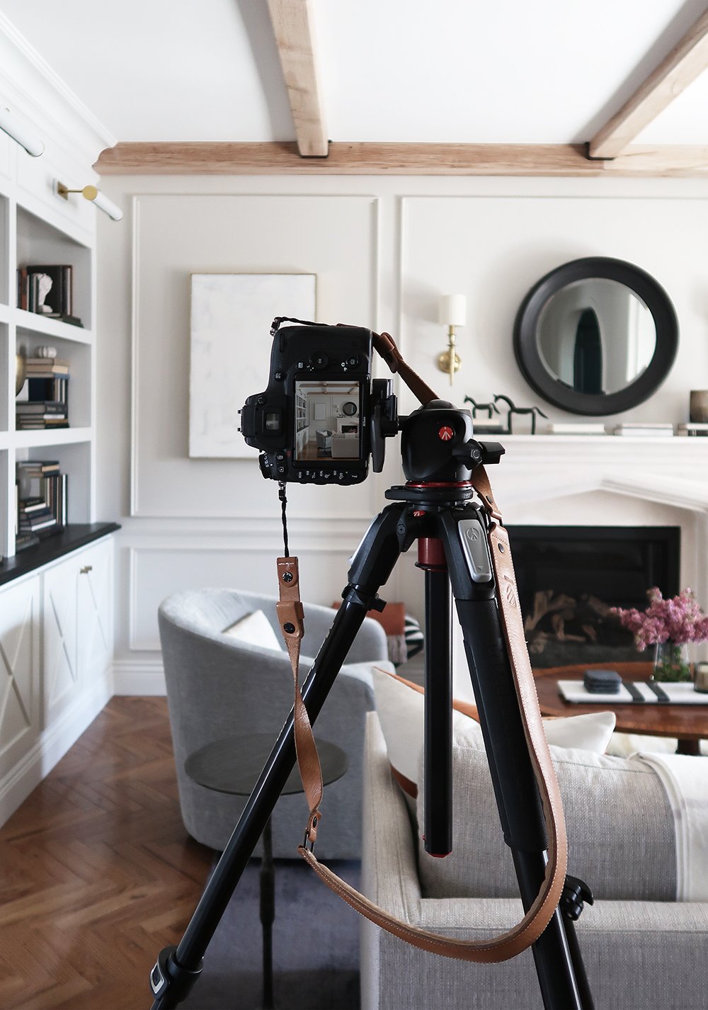 The first rule of shooting interiors is to ALWAYS use a tripod. It’s much easier to snap the room to a grid with minor tripod adjustments. A tripod is also necessary for slowing the shutter speed to make rooms nice and bright. Shooting a light-filled room is always the goal, and the only away to achieve that is by using a tripod. I’ve used this Manfrotto tripod for years and it’s my absolute favorite.