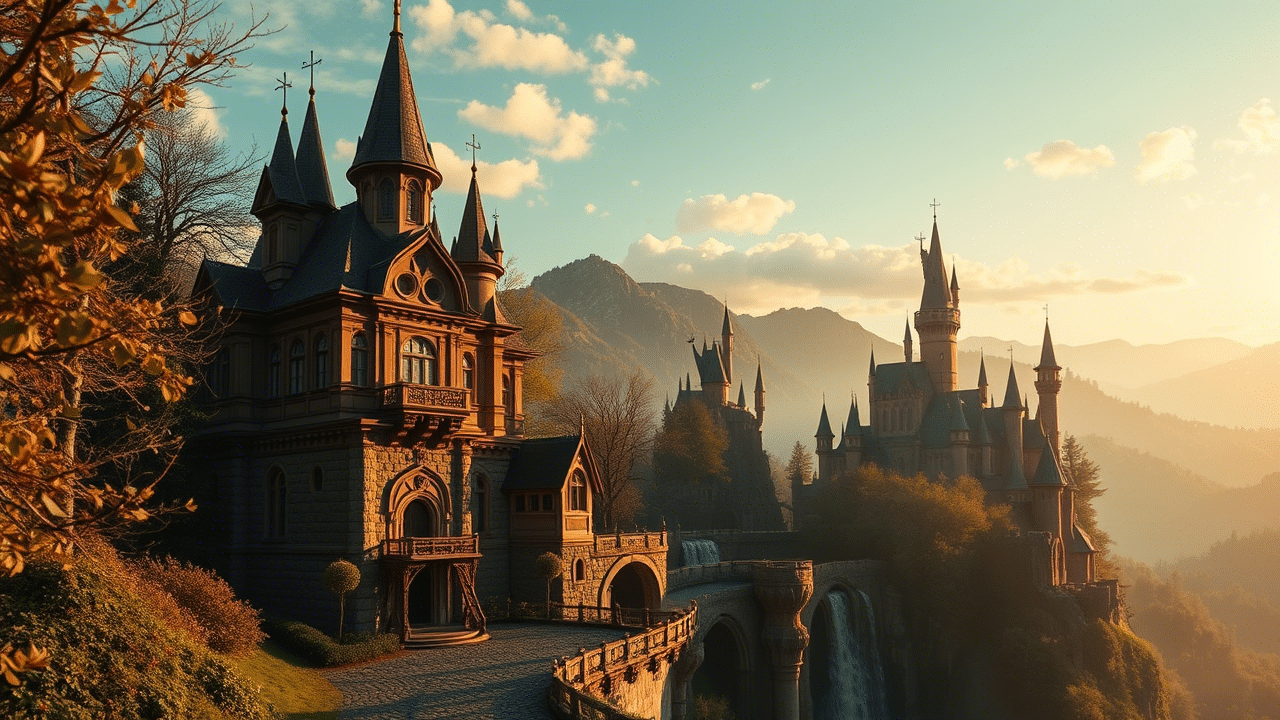 Castles pop out from forests. Palaces sit on mountaintops, looking smug. Colors are loud, shapes are weird, and fog is always lurking around the corner.