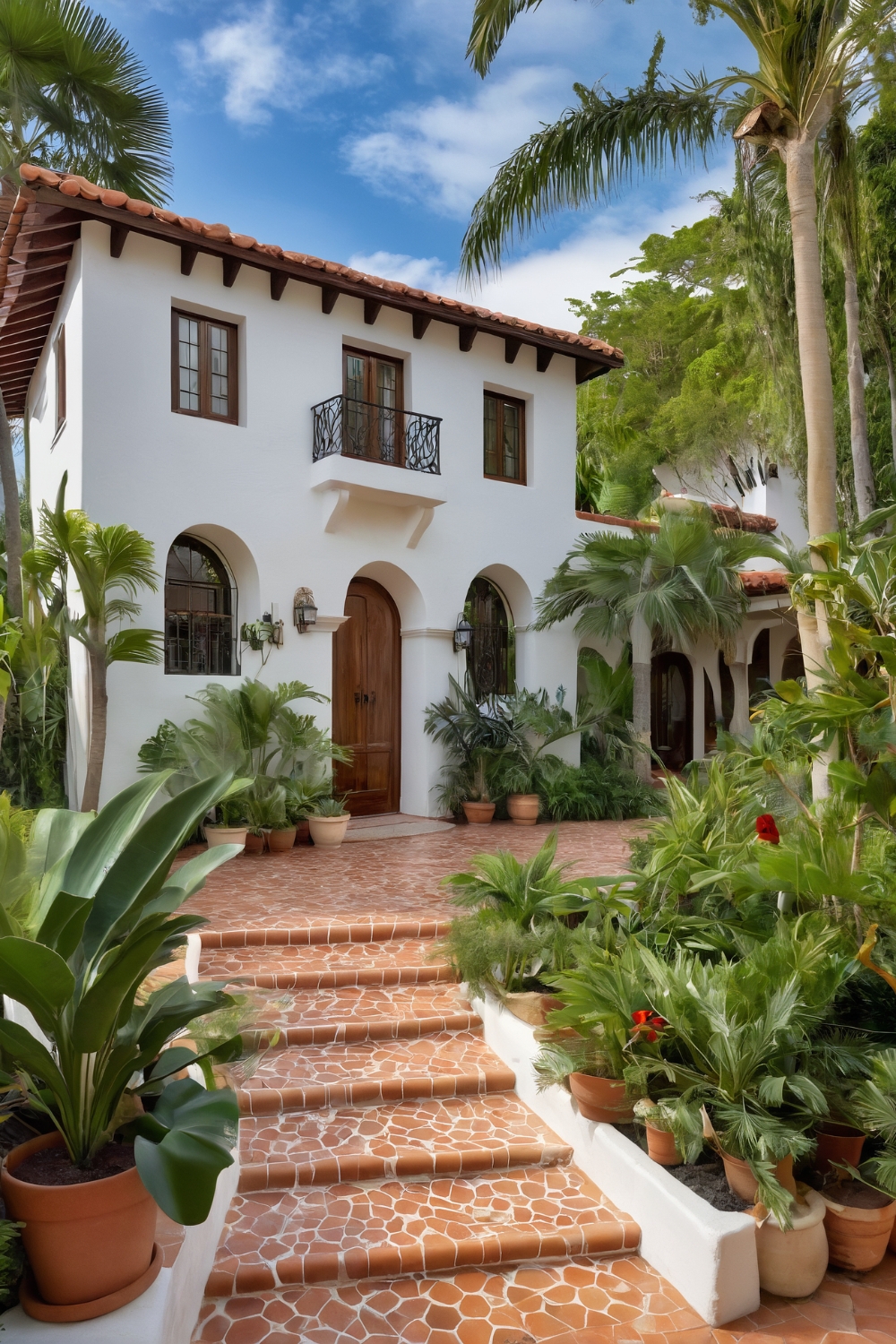 This city dwelling brings hacienda style to an urban setting. A compact courtyard with a small fountain and lush plantings creates a private retreat from the bustling city. Wrought iron balconies and terra cotta accents add authentic touches to the facade.