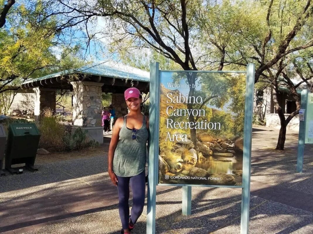 Standing in front of a park sign that says Sabino Canyon Recreation AreaStanding in front of a park sign that says Sabino Canyon Recreation Area