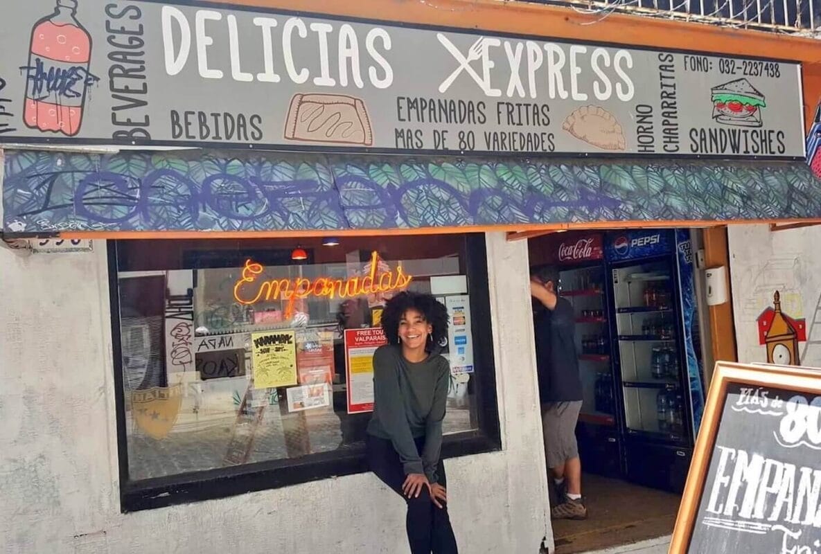 Sitting in front of an empanada bakery that says "Delicias Express: empanadas fritas. Mas de 80 variedades"Sitting in front of an empanada bakery that says "Delicias Express: empanadas fritas. Mas de 80 variedades"
