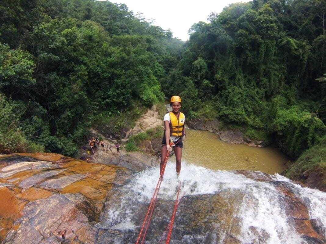 Black outdoor traveler rappelling down a waterfall, smiling up at the cameraBlack outdoor traveler rappelling down a waterfall, smiling up at the camera