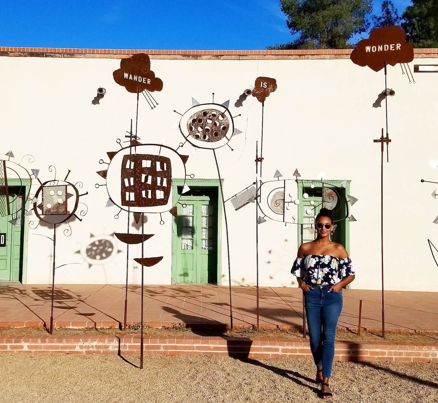Standing in front of a park sign that says Sabino Canyon Recreation AreaStanding in front of a park sign that says Sabino Canyon Recreation Area