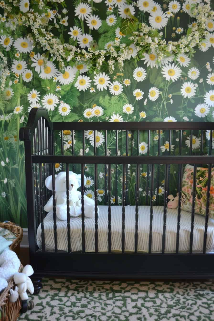 Soft watercolor daisy wallpaper or mural sets a dreamy backdrop for a white ornate crib, pastel accessories and daisy crib bedding, a plush white armchair, floral mobiles, and watercolor daisy art pieces for a whimsical atmosphere.
