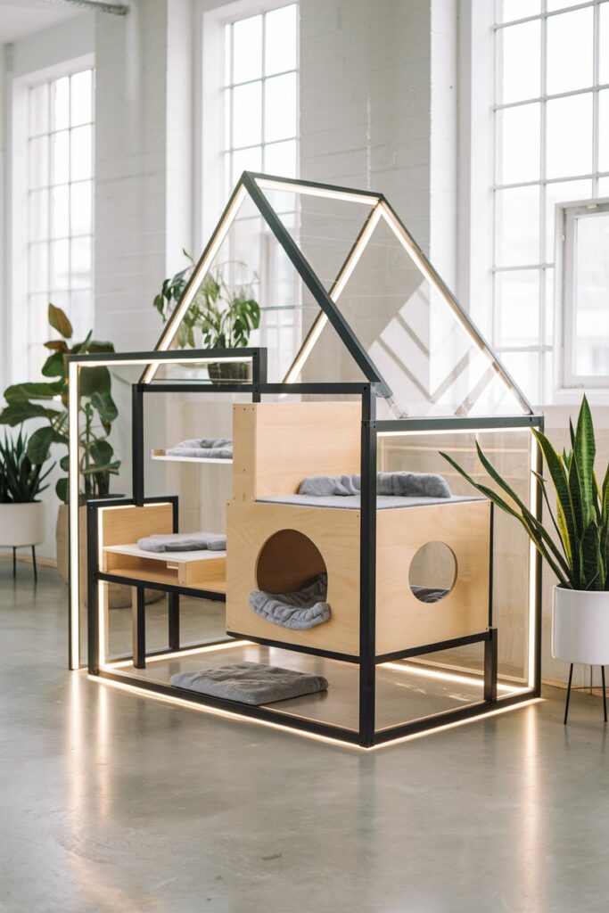 This one’s a total showstopper — the Sculptural Cat-Shaped Cat House is literally shaped like a cat. Yes, the entire structure mimics a sleek feline form, from the arched back to the pointy ears and curled tail. Designed as a functional art piece, this luxury cat house doubles as decor and sanctuary. It’s modern, unexpected, and unapologetically bold — perfect for cat lovers who appreciate playful design and statement furniture.
