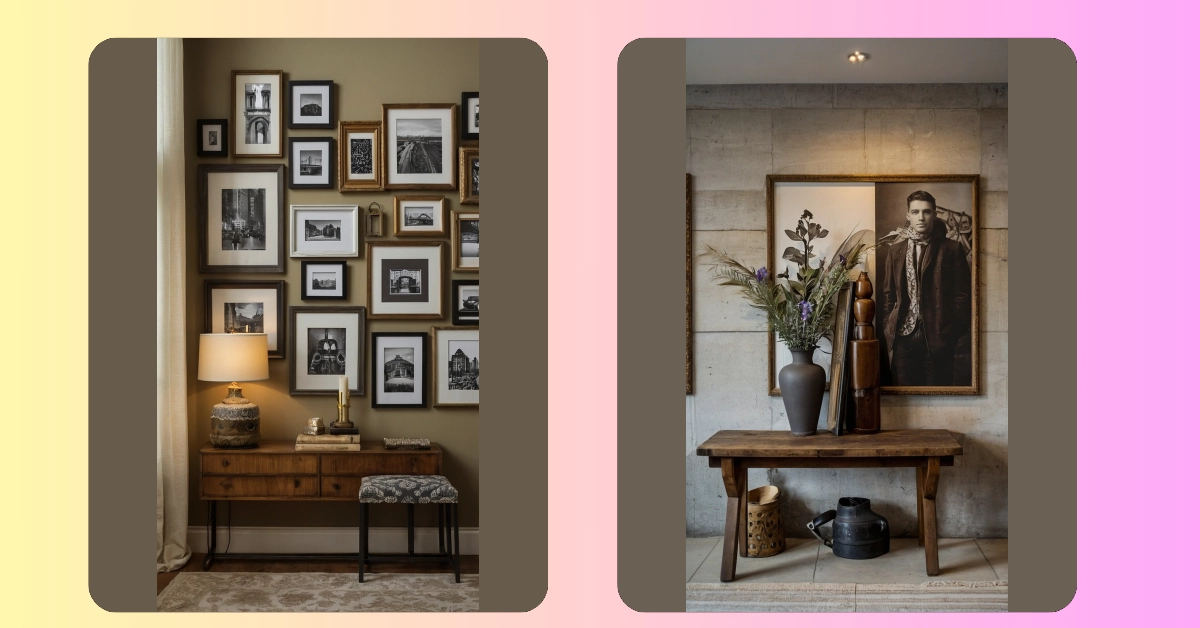 This isn’t your average wall; it’s a vintage frame gallery wall with a seriously cool vibe! Imagine stepping back in time with that awesome sepia-toned photo of a dapper dude. He looks like he just stepped out of a classic movie! The whole setup is super stylish – a mix of old and new, with that beautiful vase of flowers adding a pop of modern colour against the old-timey frames. It’s like someone took a time machine, gathered the coolest stuff from different eras, and put it all together for a seriously awesome display.