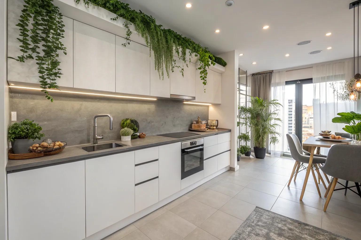 Incorporate green plants with grey countertops to add a touch of nature. The contrast is refreshing and adds life to the kitchen decor.