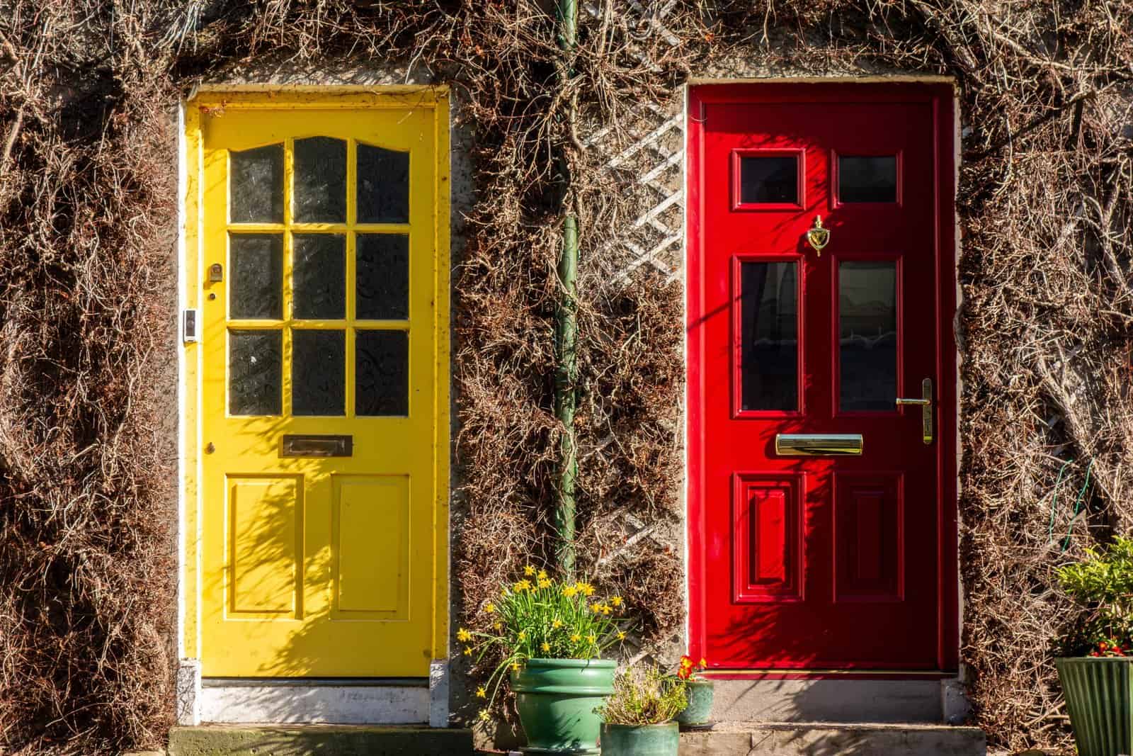 Yellow doors are best paired with neutral or dark exteriors, allowing the color to stand out.