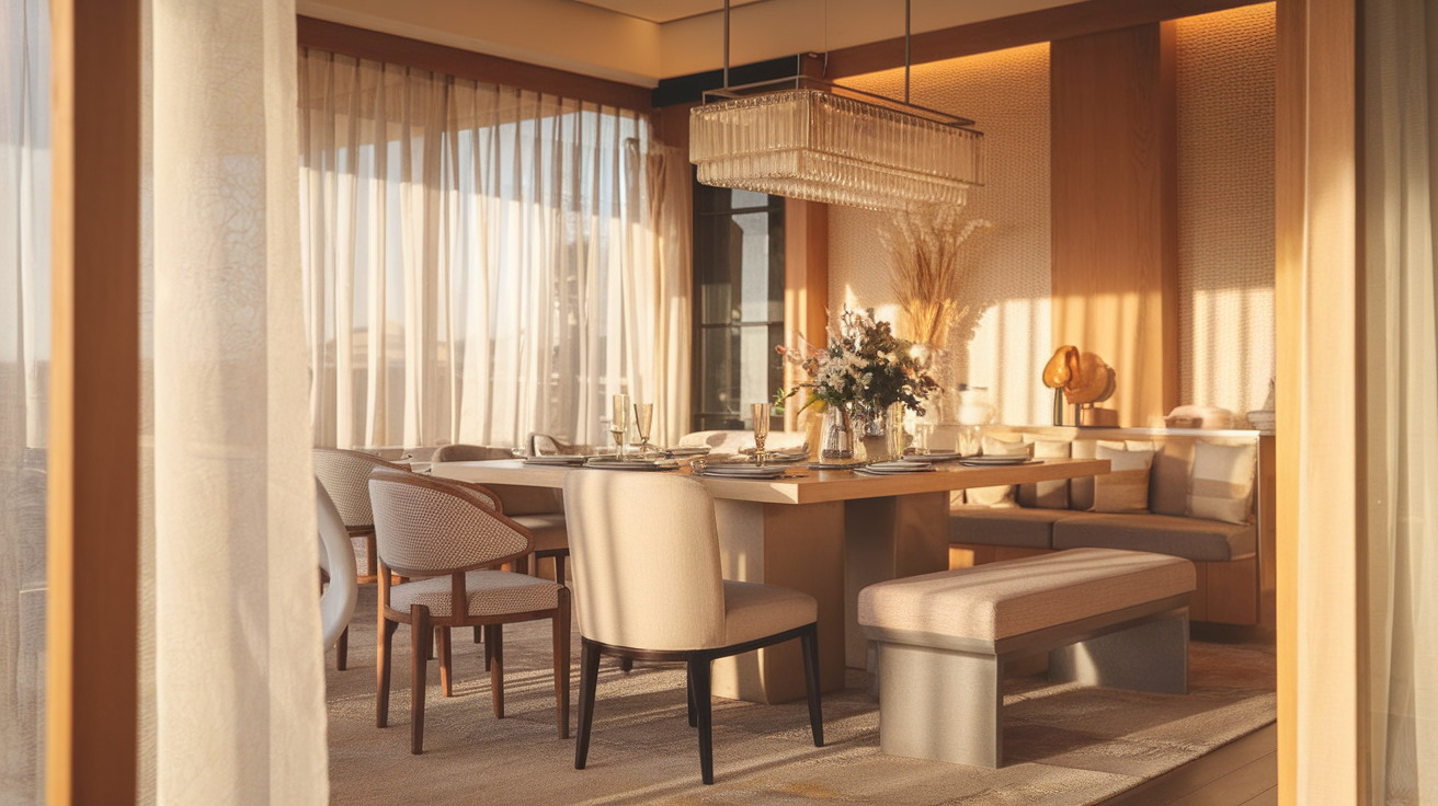 The plush, light-colored chairs add a touch of comfort, encouraging everyone to linger a little longer over dinner. The soft lighting, accentuated by the modern wall features, creates an atmosphere that is both sophisticated and approachable.