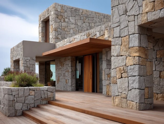 Modern and minimalist natural stone cladding offers a sleek and sophisticated look that complements contemporary architectural styles. This clean and simple design uses natural stone to create a minimalist and uniform look that emphasizes the home’s architectural lines.