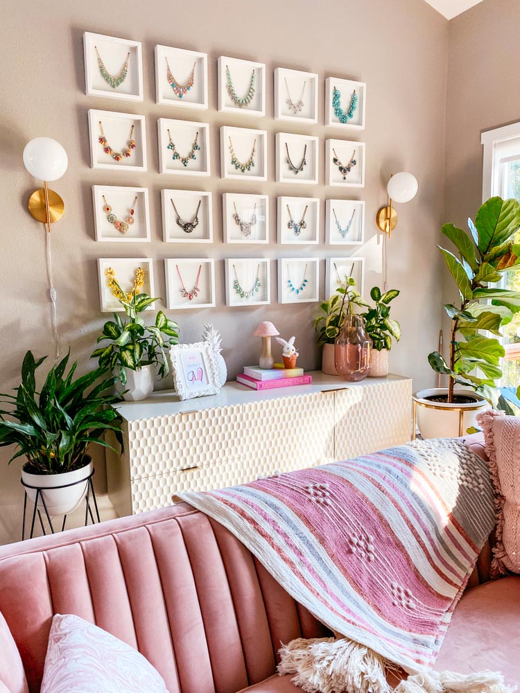 My husband used frames from Ikea and then cut and measured boards to fit the frames and then drilled the holes to hold the necklaces. We then taped the necklaces to the back of the board.