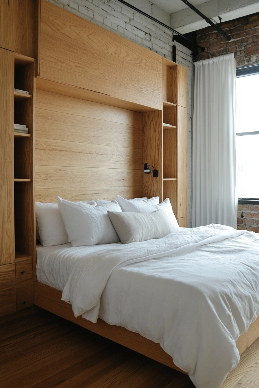 Maximize space in a small bedroom with a built-in headboard that seamlessly integrates storage. This stunning wood design blends warmth with functionality, featuring open shelves for easy access to books and essentials. Pair it with crisp white bedding and soft lighting to create an inviting and clutter-free retreat.