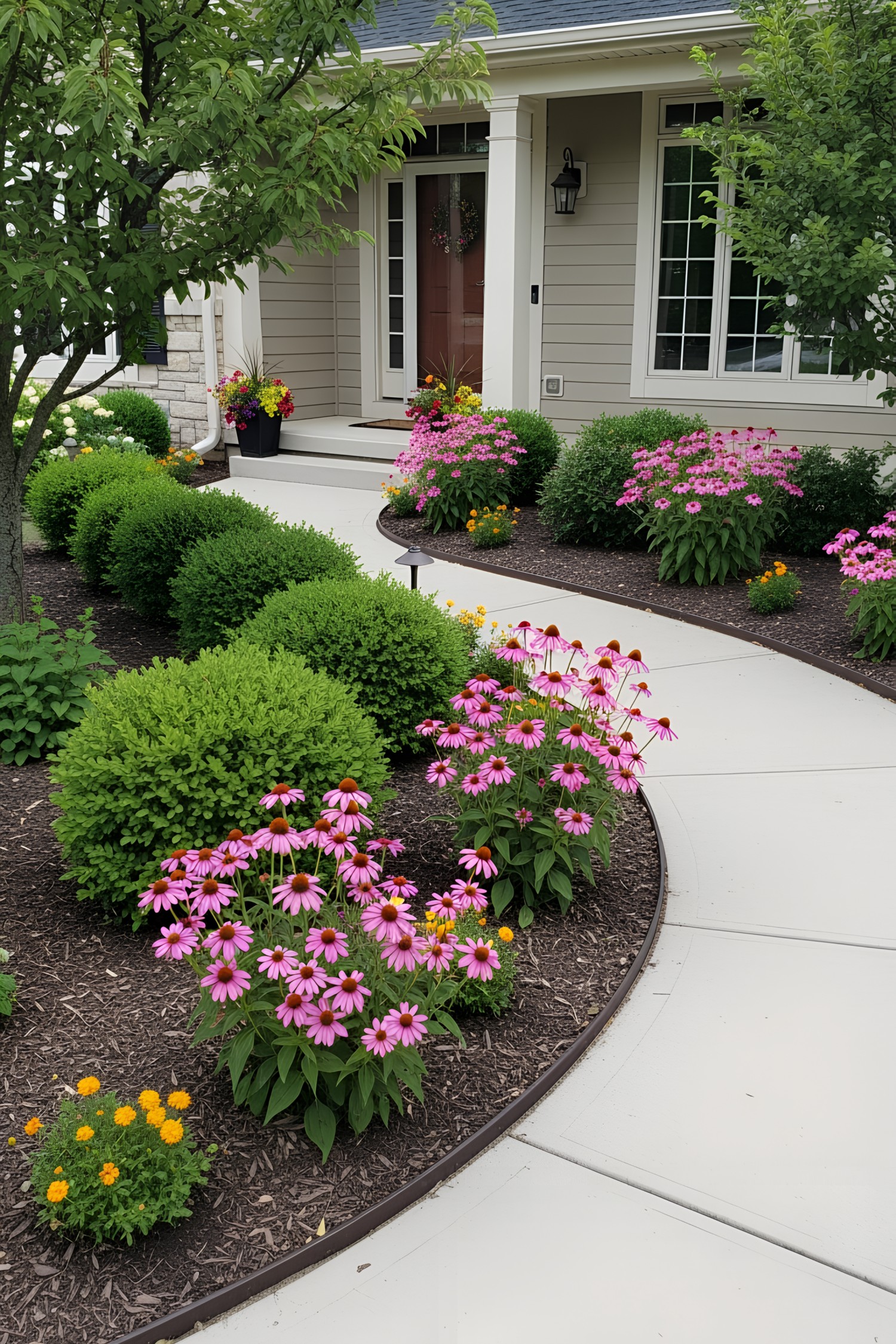 The front yard showcases a delightfully curving walkway made of smooth stone that gracefully weaves through a garden symphony of pink coneflowers and vibrant foliage. This little Eden is packed with lush green shrubs, ensuring the neighbors will definitely steal a peek if they aren’t too busy keeping up with their own lawns.