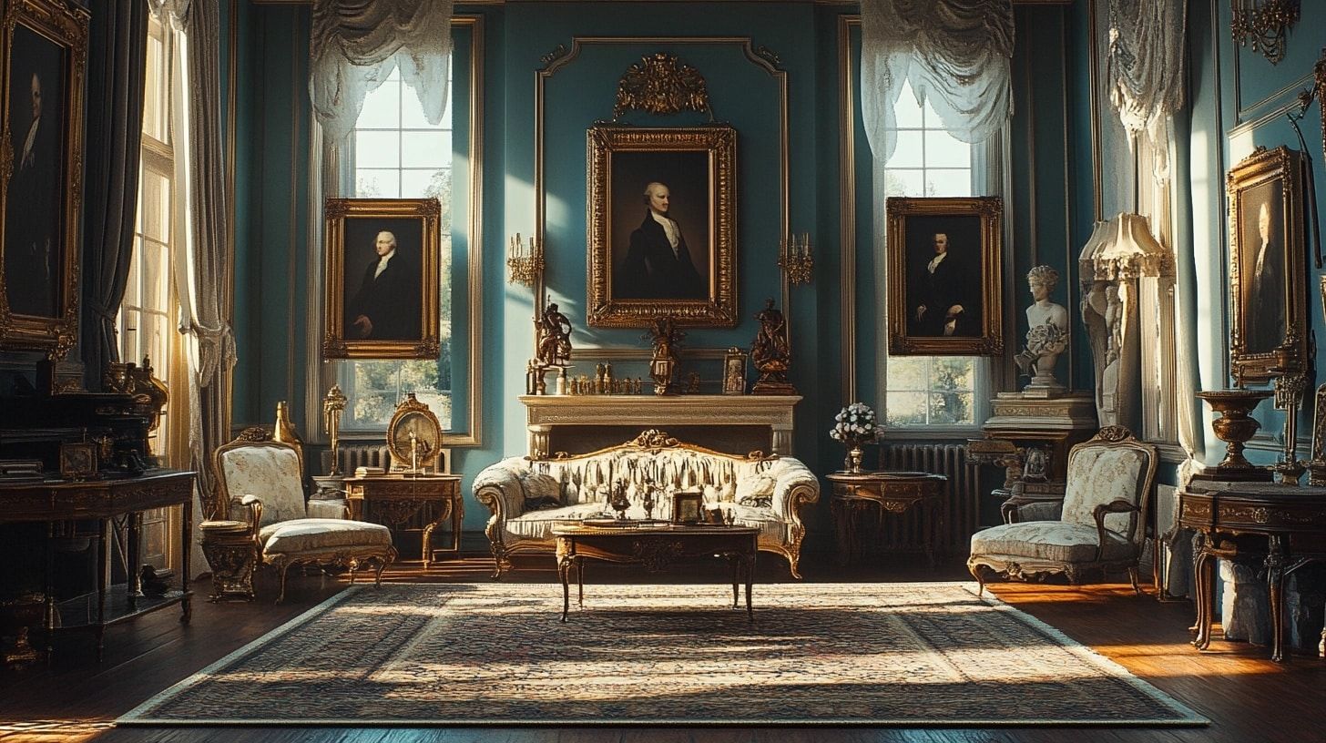 The vintage aristocratic room showcases elegant mirrors, vintage furniture, and timeless rugs, offering a refined atmosphere for an old money living room.