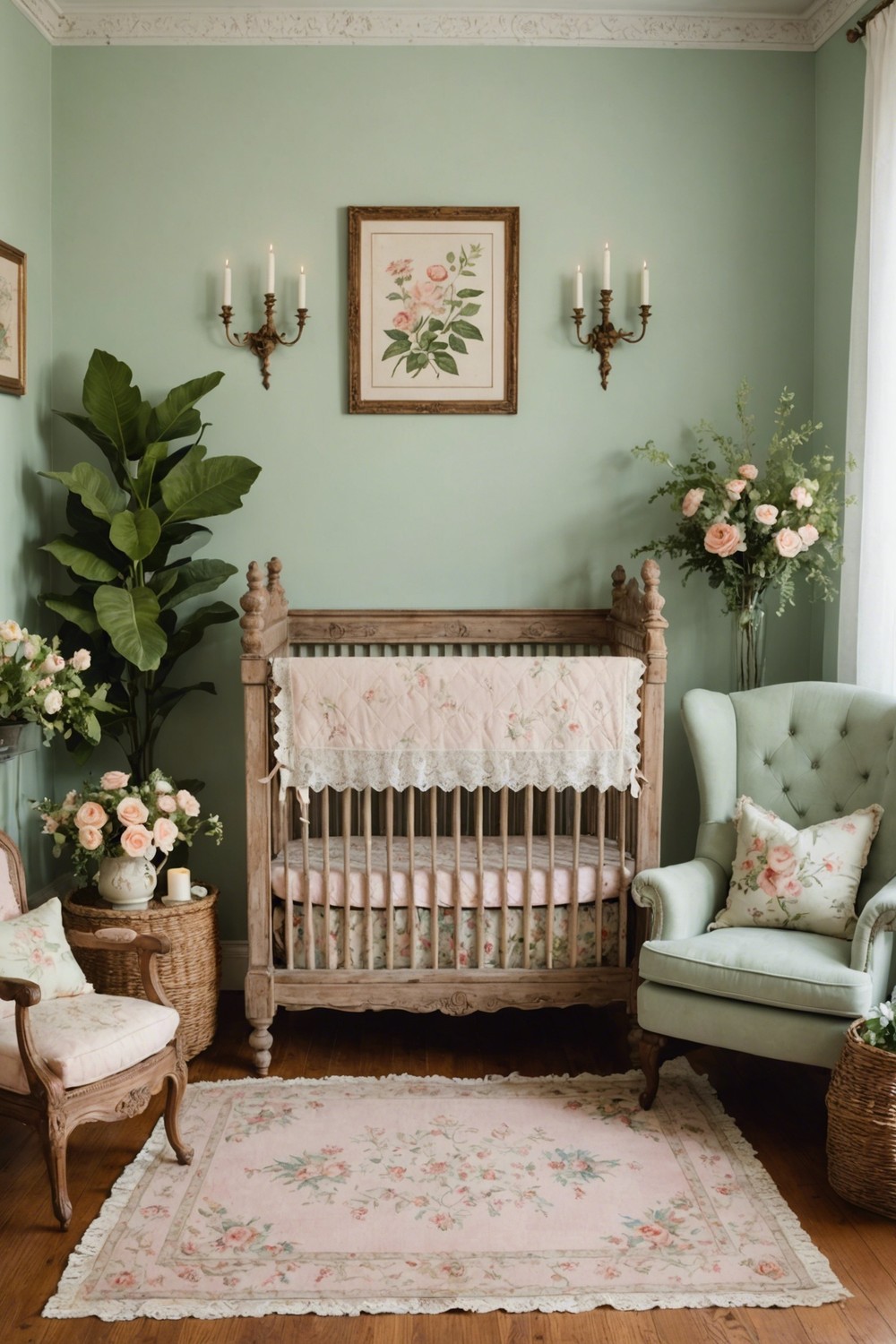 Add plush furnishings, like a tufted ottoman or intricately carved crib, to complete the luxurious vintage vibe.