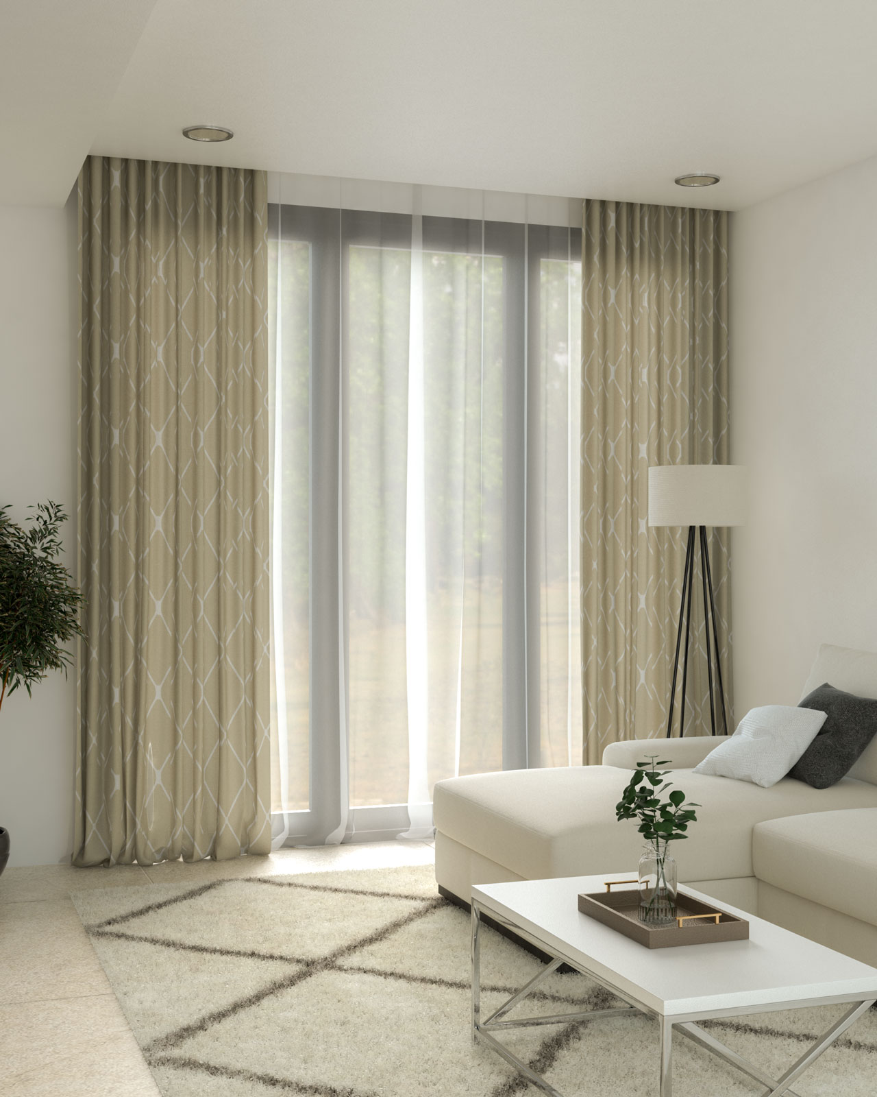 Beige is a wonderfully versatile neutral option that effortlessly complements any design scheme. But why stop there? Take your curtains to the next level by opting for beige curtains with white accents or patterns, just like the captivating example showcased in the image above.