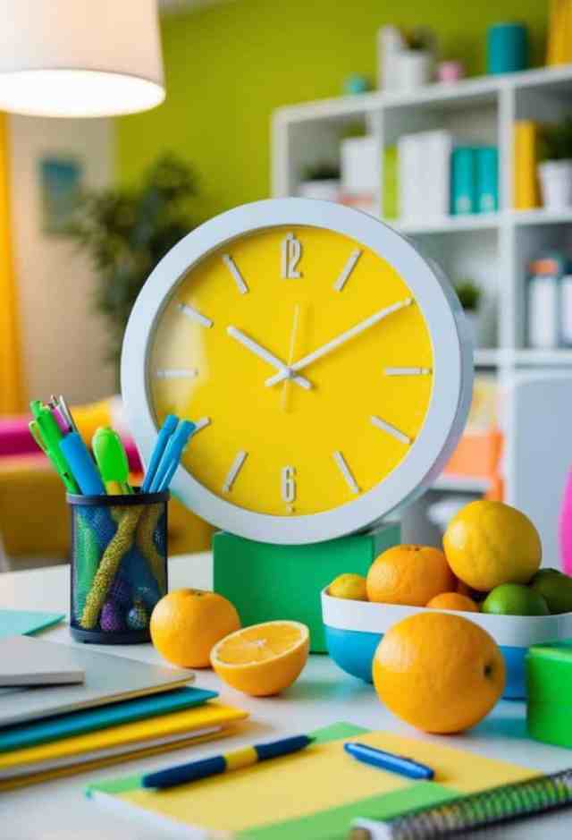 Add a zesty pop to your home office with a citrus-themed wall clock. Choose a design that features bright lemon, orange, or lime slices. These cheerful timepieces bring a fresh, energizing vibe to your workspace.