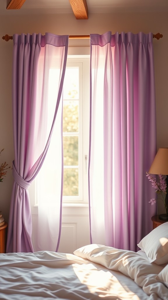 Soft, lavender window treatments can create a serene and inviting atmosphere in your bedroom. Choose sheer, light fabric curtains in lavender to allow soft, diffused light to filter through, enhancing the color without overwhelming the space. This style not only brings charm but also maintains privacy.