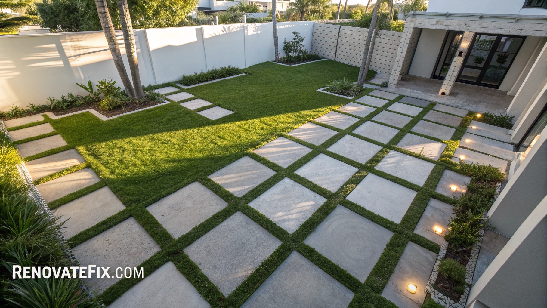Asymmetrical concrete slabs arranged in mathematical precision create rhythm across ground surfaces, drawing the eye through the landscape while providing practical walking paths.