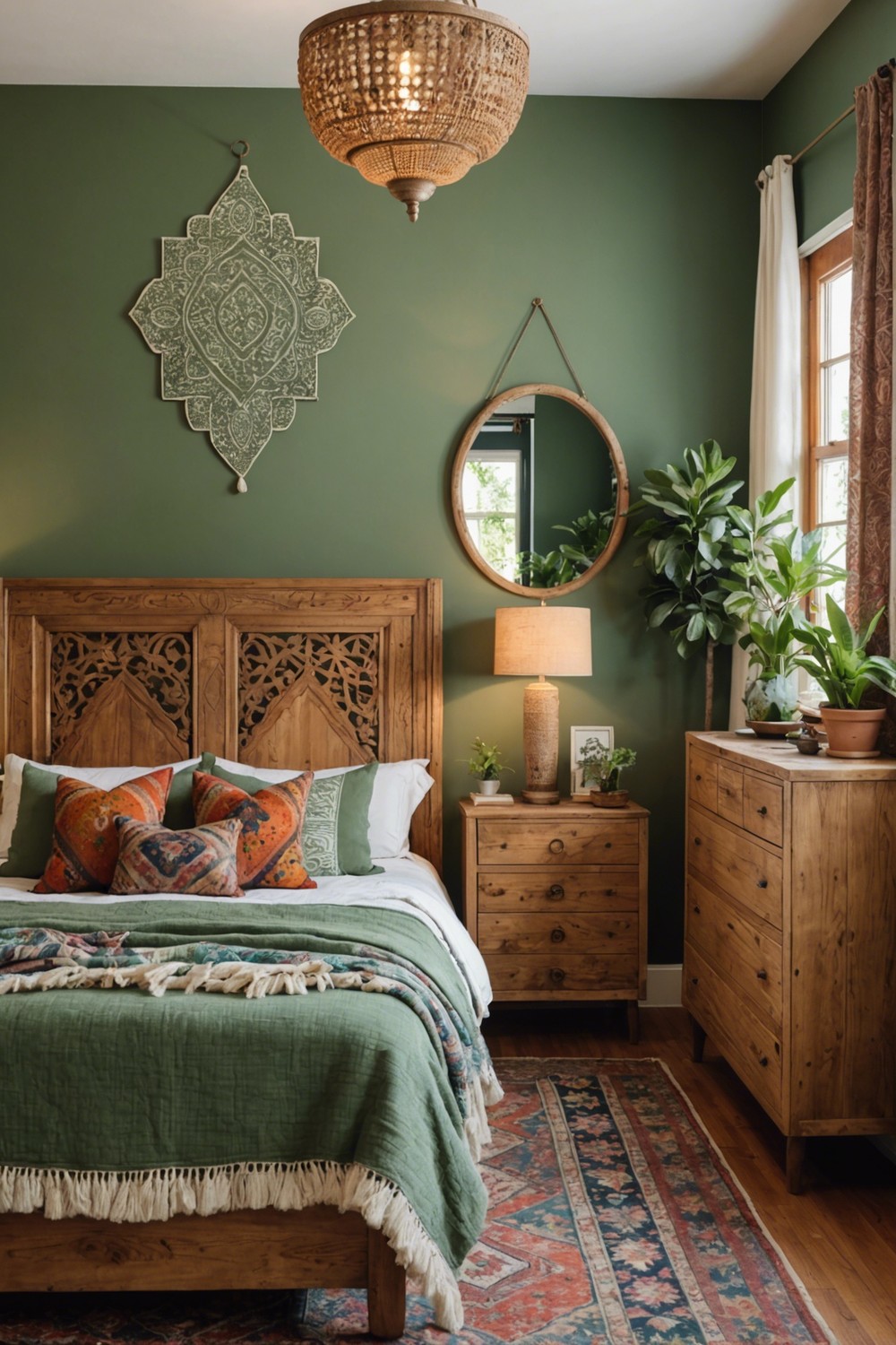 Sage Green Accent Walls with Bohemian Patterns bring a unique charm to your bedroom.