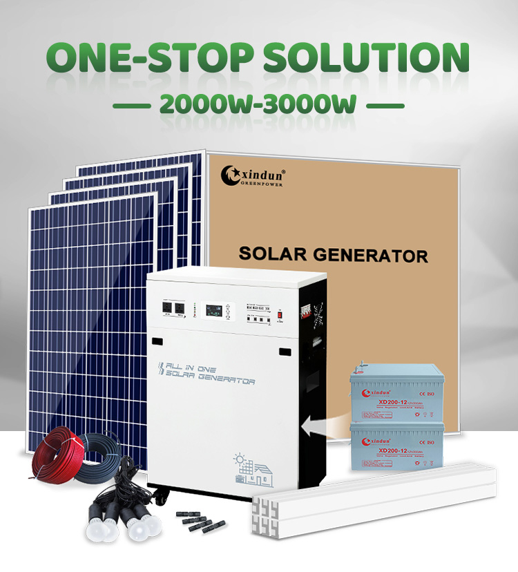 Xindun home solar system is the most complete configuration on the market, which includes all necessary components: solar panel, solar bracket, solar battery, solar inverter, solar charge controller, pv cables, battery cables and other terminals. Significantly, solar battery, solar inverter and solar charge controller are all in one solar generator cabinet. After the simple installation is complete, it can be directly used for home appliances.