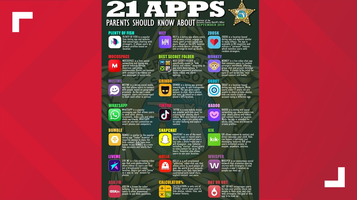 SARASOTA COUNTY, Fla. — Following the arrests of 23 men accused of traveling to meet people they thought were children for sex, the Sarasota County Sheriff’s Office has updated its widely-circulated list of apps parents should know about.