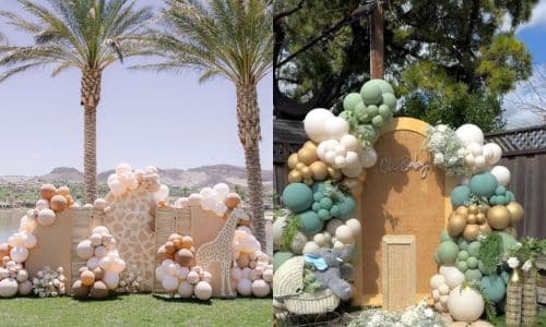 If you’re hosting a baby shower outdoors, what better than leaning into using a giraffe for the main theme. Neutrally colored, draw out the warm neutrals from the print, using a mix of colors in your balloon arch and decor for a gender neutral theme.