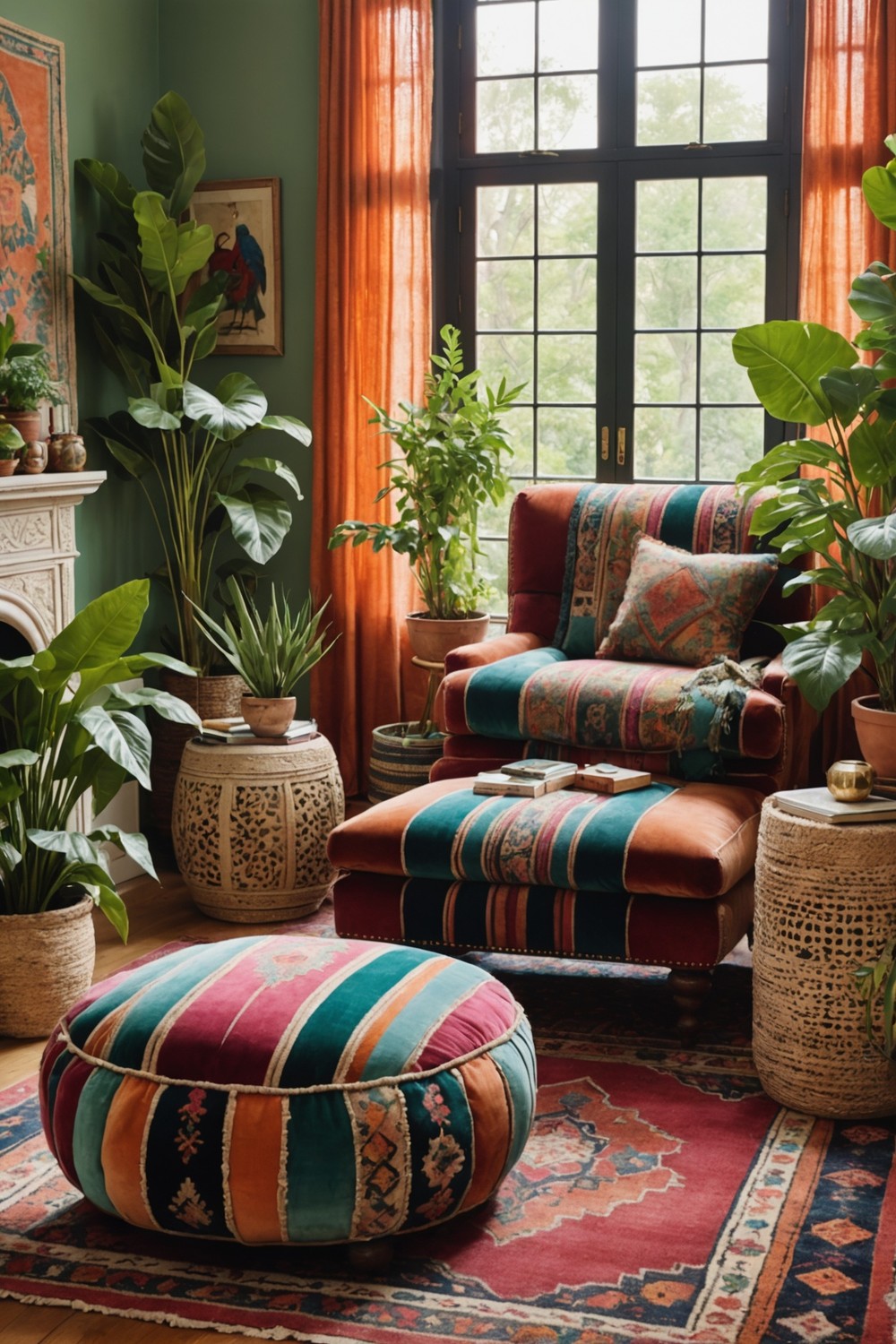 Mix and Match Patterns and Textures Bohemian style is all about embracing eclecticism, so don’t be afraid to combine different patterns and textures. Pair a velvet armchair with a Moroccan-inspired ottoman, or layer a vintage Moroccan rug over a natural fiber sisal rug.