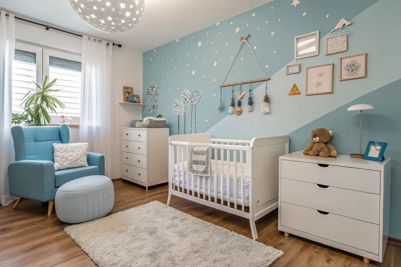 A soft blue and white palette creates a tranquil atmosphere perfect for a baby boy’s room. These colors have an innate ability to calm both baby and parents, making them a timeless choice.
