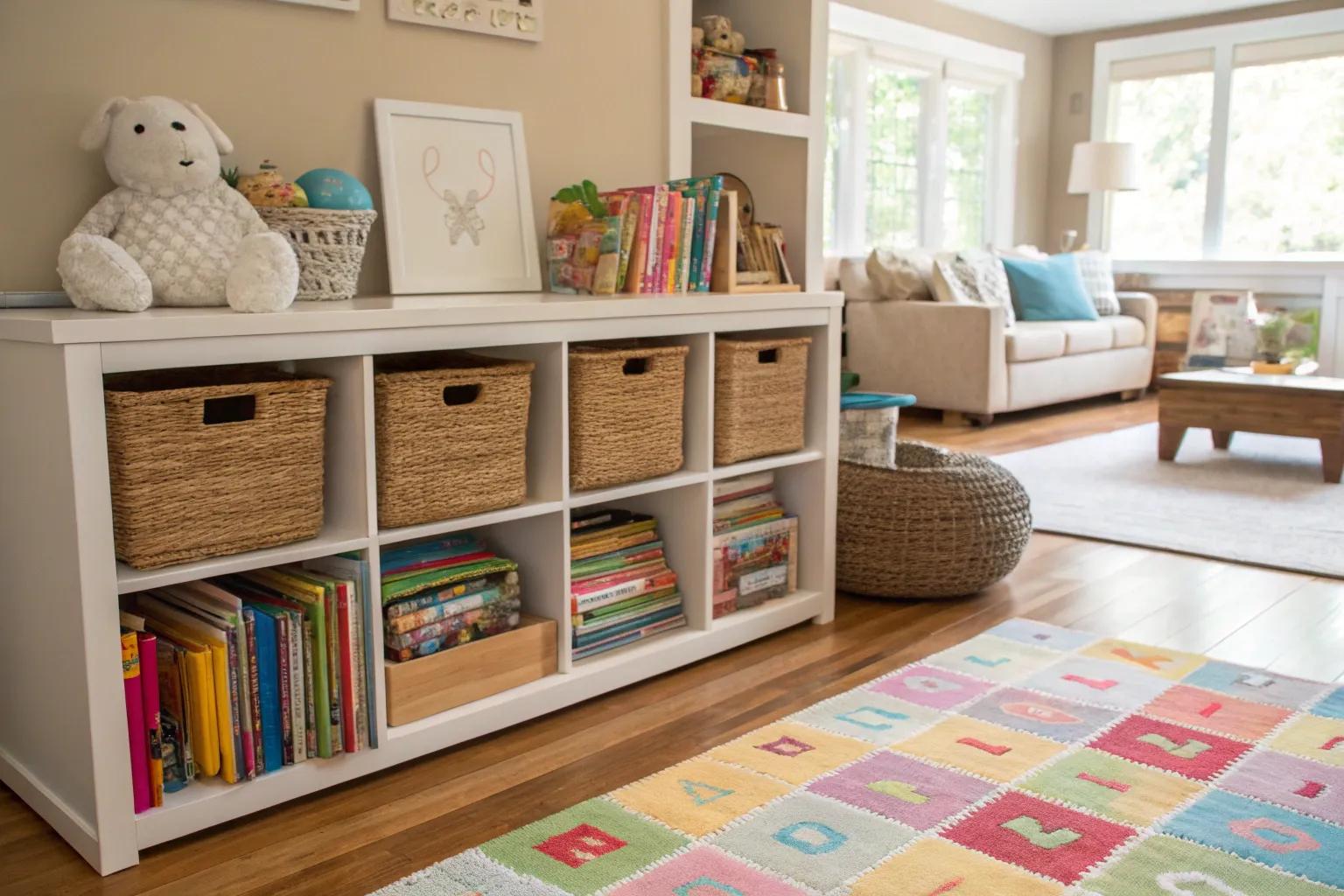 - Wicker Storage Baskets: Organize and hide toys effortlessly with stylish wicker baskets on your shelves.