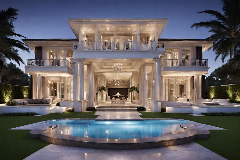 A sprawling modern mansion featuring opulent amenities, expansive living spaces, and floor-to-ceiling windows offering breathtaking panoramic views of the surrounding landscape, epitomizing luxury living at its finest.