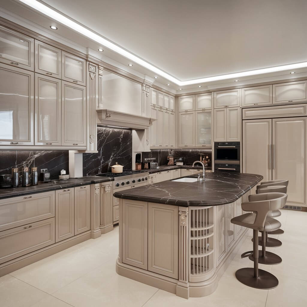 Champagne Beige pairs well with gleaming stainless steel appliances, natural wood accents, or glossy marble countertops, creating a space that feels both opulent and timeless.