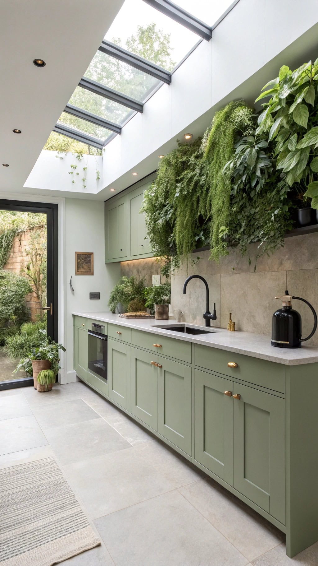 Looking to bring the outside in? Transform your kitchen into a lush oasis by pairing sage green cabinets with a stunning vertical garden wall! This biophilic design creates an incredible focal point while keeping your space feeling fresh and alive. Your sage cabinets will feel right at home among the cascading greenery.
