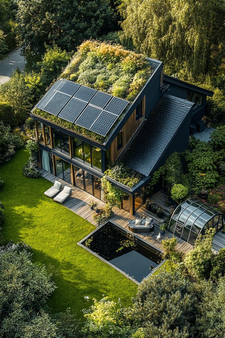 birds eye view of a modern cottage with green living roof and solar panels a lush garden with trees and a poind a greenhouse a lounge area onbirds eye view of a modern cottage with green living roof and solar panels a lush garden with trees and a poind a greenhouse a lounge area on