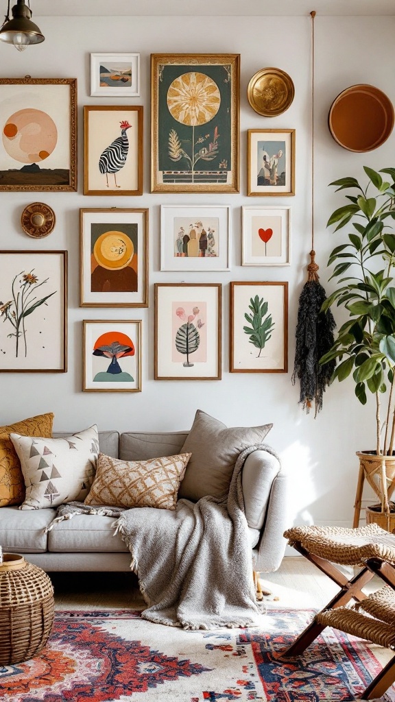 A cozy living room with an eclectic wall art display, featuring various framed artworks and a comfortable sofa.