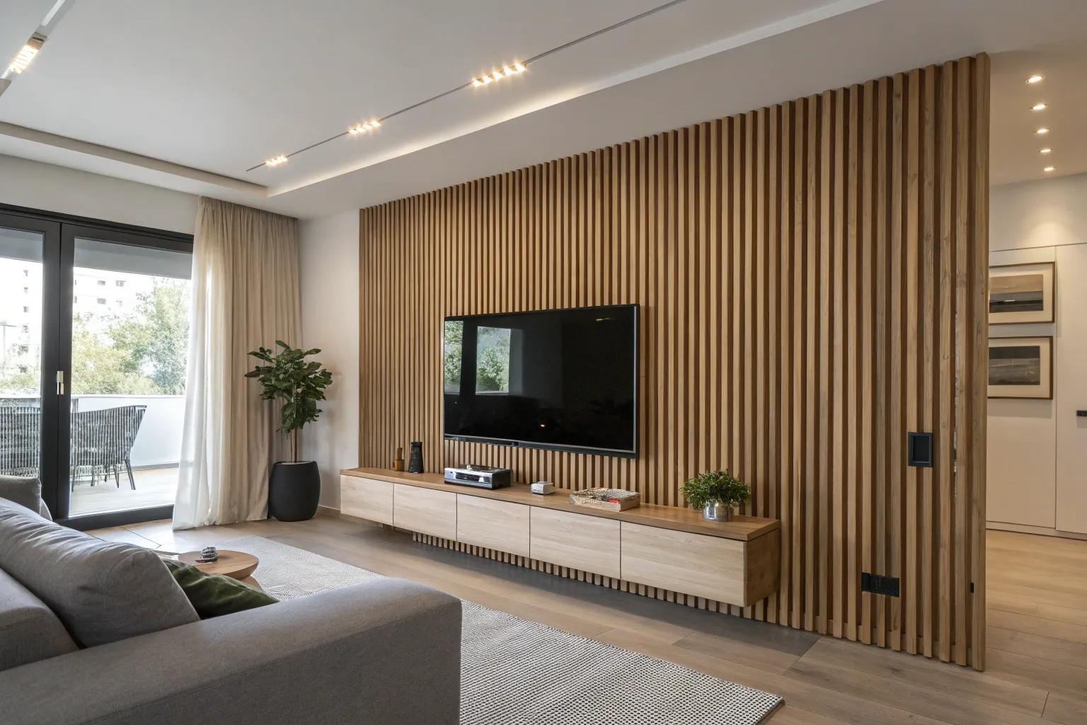 Opt for vertical wood slats to add height and elegance to your TV wall. This design trick draws the eye upward, making rooms feel taller. It’s a favorite in my own apartment, where space is at a premium.