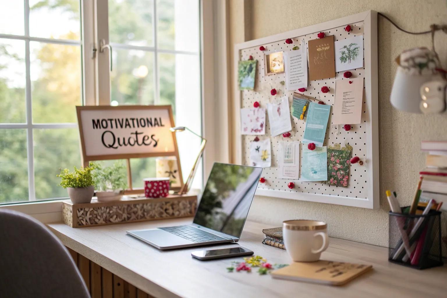 Inspire daily positivity with a bulletin board dedicated to motivational quotes and affirmations. Similar to how you might use vision board journal ideas, this setup can serve as a daily boost, keeping you focused and uplifted. I rely on this board in my home office to maintain a positive mindset.