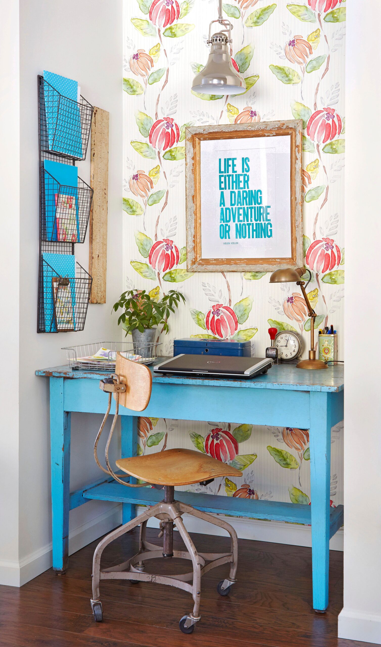 Fashion a small office area for bill paying—and Pinterest searching—with flea market finds. Repaint a table or desk to serve as a work surface. Frame a print-it-yourself design with a secondhand frame for a quick DIY art project.