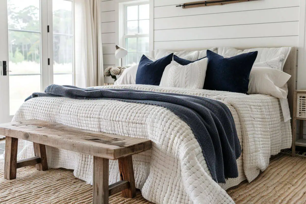 A cozy coastal bedroom with a white and navy blue color scheme. The bed is covered in a textured white quilt with navy blue pillows and a matching blanket. A rustic wooden bench is placed at the foot of the bed, adding a touch of farmhouse charm.A cozy coastal bedroom with a white and navy blue color scheme. The bed is covered in a textured white quilt with navy blue pillows and a matching blanket. A rustic wooden bench is placed at the foot of the bed, adding a touch of farmhouse charm.