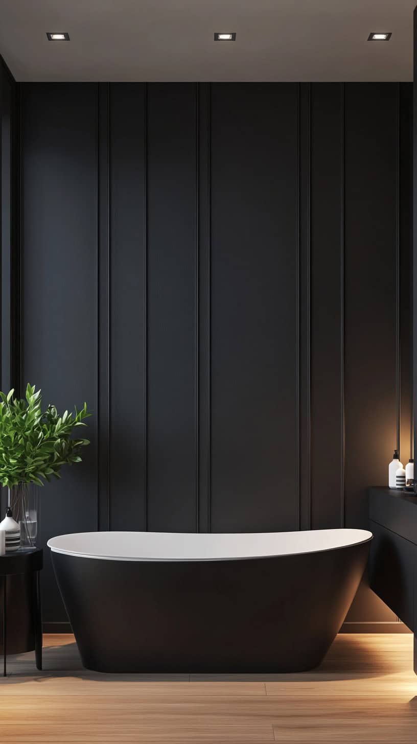 This modern bathroom has sleek black panel walls with a floating sink and a bathtub.