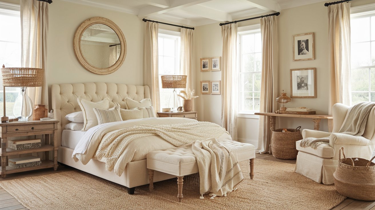 Soft, inviting, and brimming with farmhouse charm, this creamy beige bedroom feels like a warm hug at the end of the day. A plush beige tufted bedframe stands at the heart of the room, layered with cream-colored bedding and an assortment of cozy knit and linen throws. Vintage framed photographs and woven baskets scattered throughout provide personal touches and subtle layers of character.