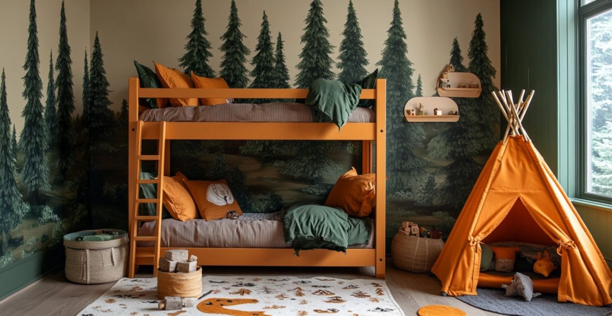 If you’re aiming for a camp-like vibe, designing the bunk beds with natural wood tones is the way to go.