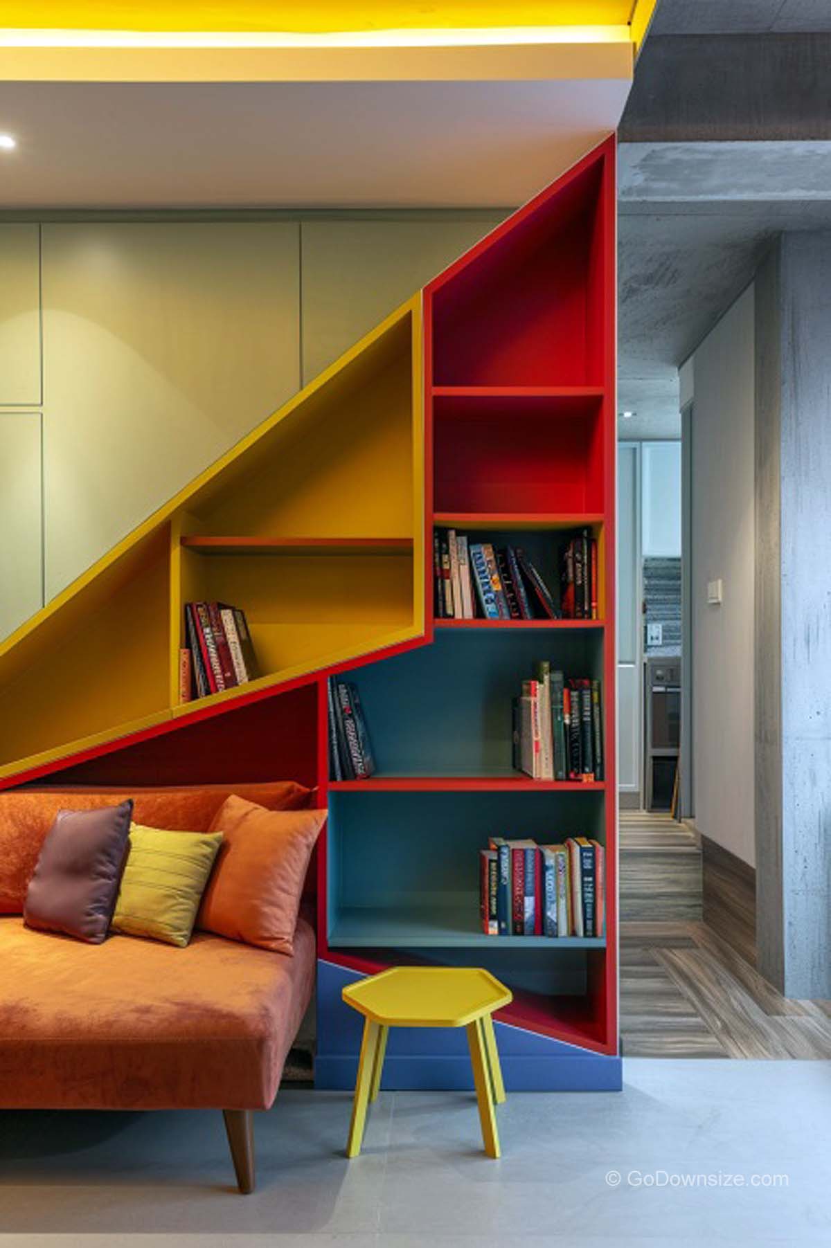 It uses sharp shapes and an odd arrangement to store your books uniquely. Each compartment also alternates the colors of the rainbow for a multi-hued structure.