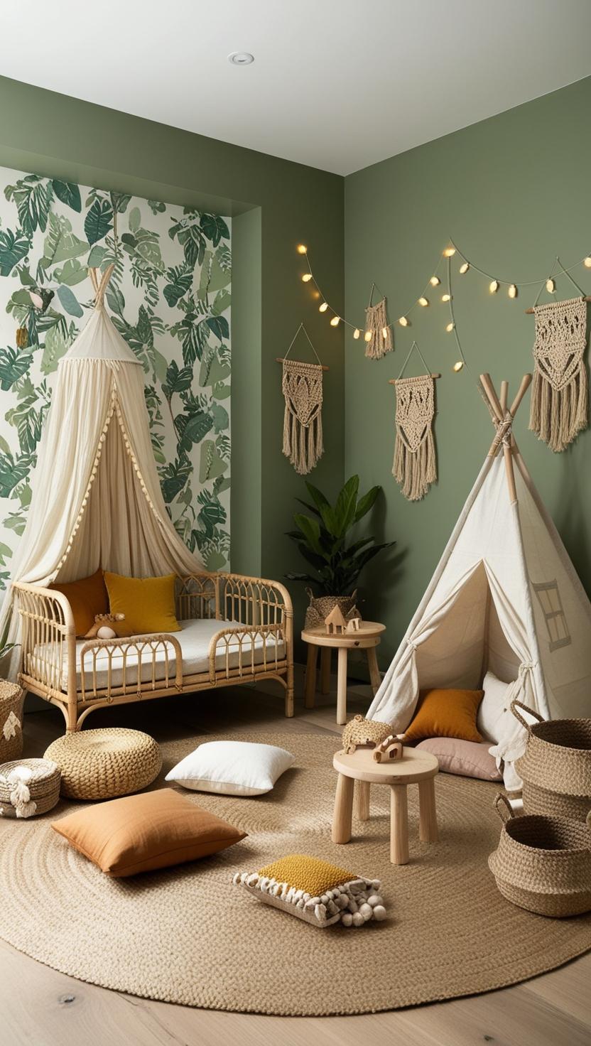 Tapeten mit grünen Pflanzenmustern sind ein echter Hingucker und bringen das Gefühl eines botanischen Gartens ins Kinderzimmer. Dieses Design eignet sich besonders gut für Kleinkinderzimmer Ideen, da es eine entspannende Atmosphäre schafft.