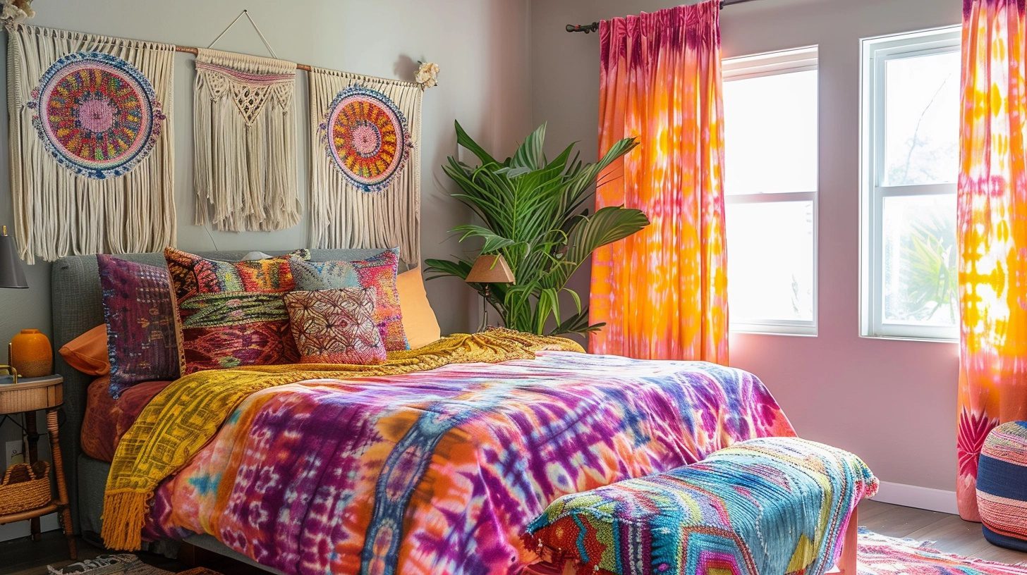 Brighten your bedroom with vibrant tie-dye curtains. These playful and colorful treatments infuse your space with bohemian flair and a cheerful ambiance.