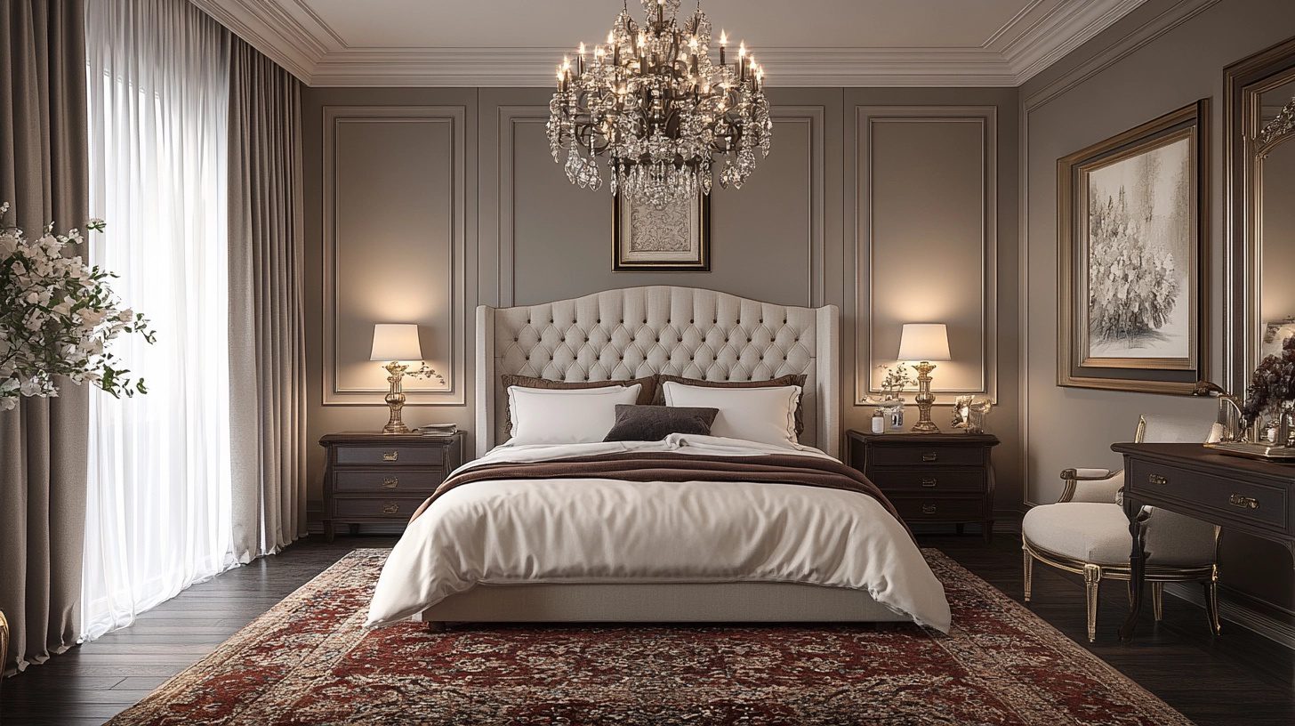 The Neoclassical Modern Nuance vintage modern bedroom mixes neoclassical symmetry with modern decor, creating an elegant and timeless space