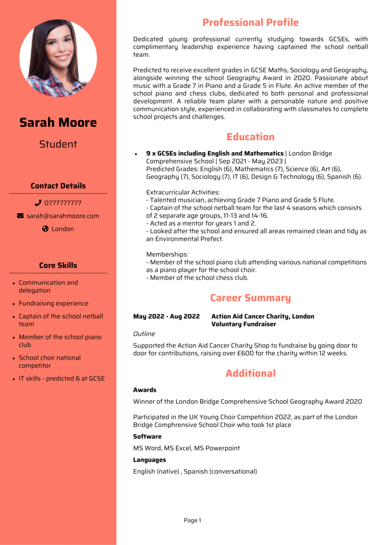 As a school leaver, this should be a fairly comprehensive section to help make up for your relatively little experience: list anything you think will show that you’re a good fit for the role.