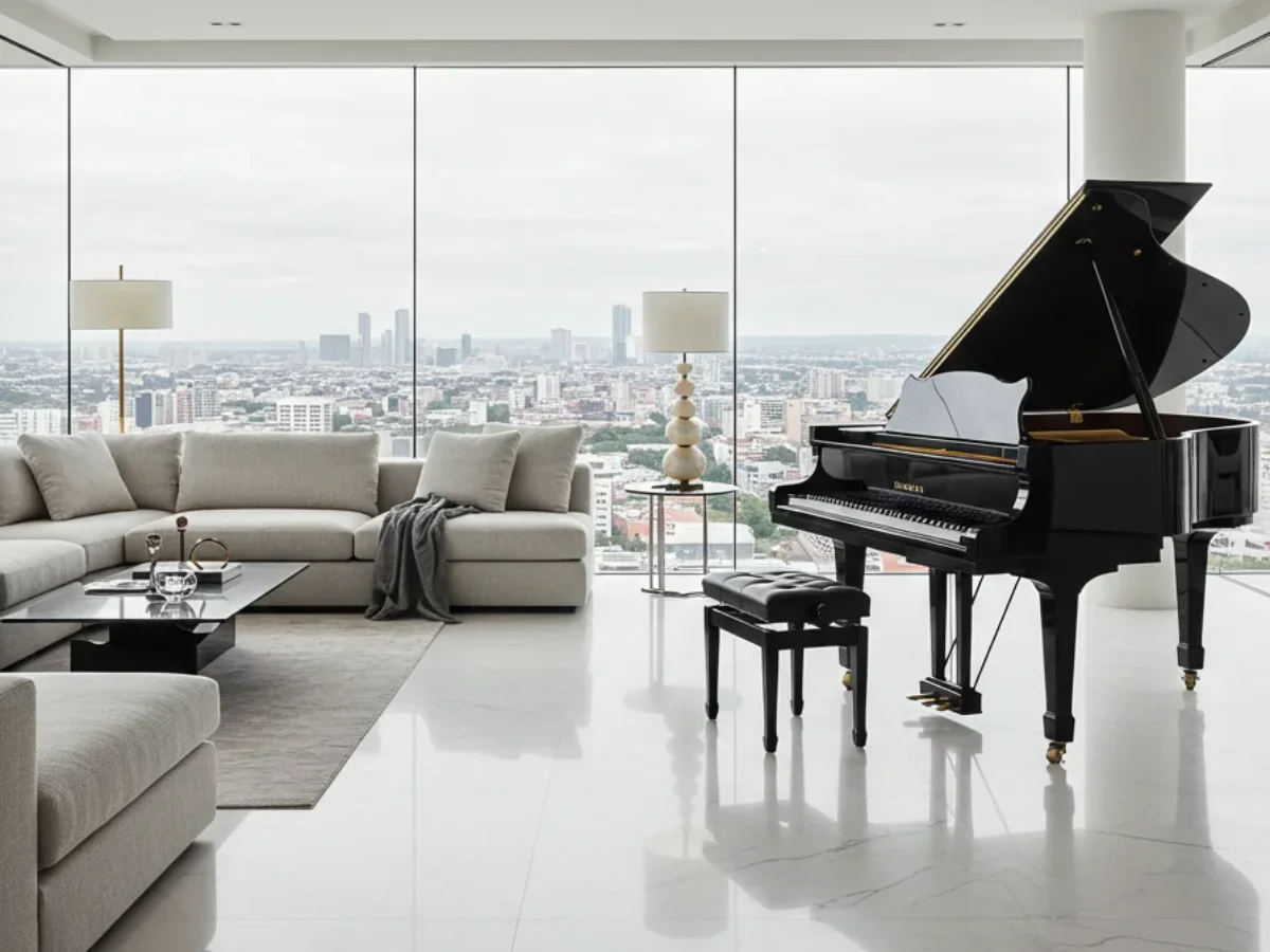 A sleek, minimalist living room with a glossy black grand piano takes center stage on a white marble floor. Clean lines and neutral tones define the space, complemented by a low-profile sectional sofa. Large floor-to-ceiling windows flood the room with light, offering a panoramic city skyline view, creating an atmosphere of effortless modern luxury.